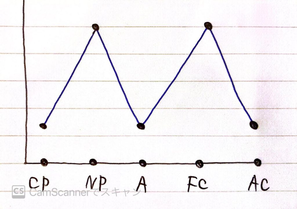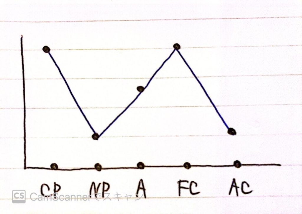NPを頂点とし、FCが最も低いのが特徴です。周囲に優しくすることができる献身的な状態なのですが、ACが高すぎると他者依存的・自己犠牲的になってしまうことがあります。