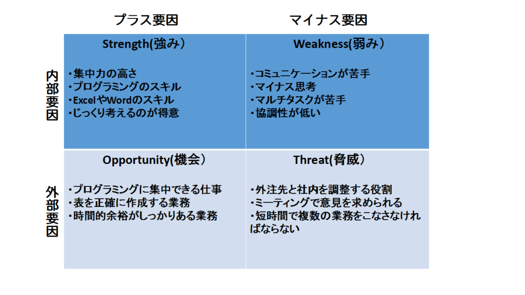 SWOT分析は、元は企業が自社の分析を行うために考案した方法ですが、実は企業を個人に当てはめて、自己分析にも活用することができるんです。市場価値を生み出す者として、自分=小さな会社と考えることもできますからね。