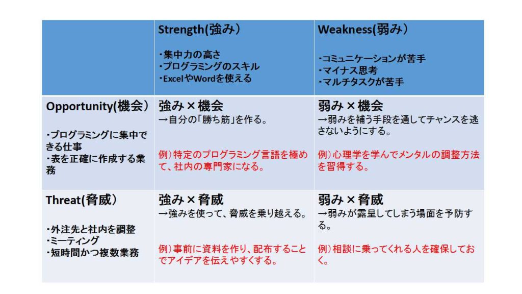 上の画像を見てみましょう。内部要因2つとと外部要因2つをそれぞれ掛け合わせ、具体的な策を考えているのが分かると思います。