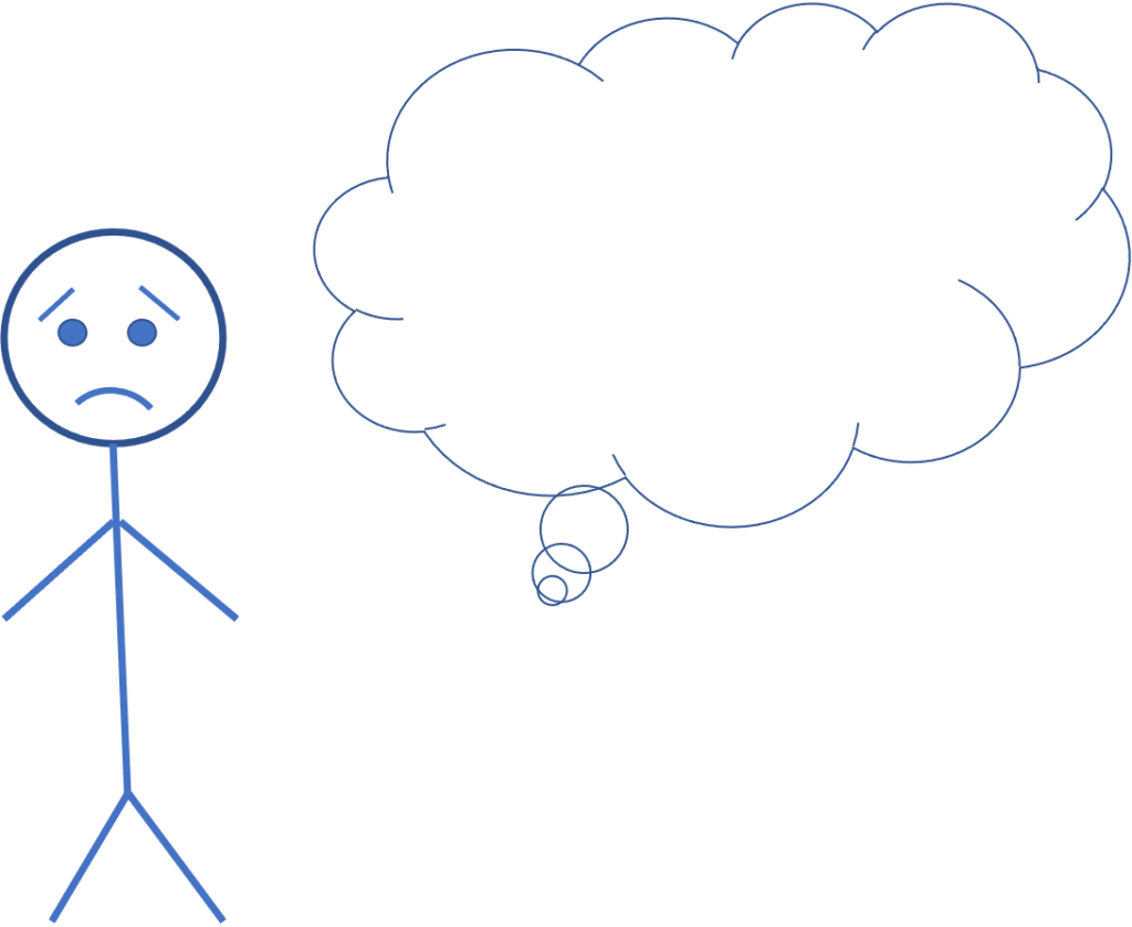 この人は、何だか困ったような顔をしていますね。この人を自分に置き換えて、頭の中で何とつぶやいているか考えてみましょう。そこで出てきた考えが、あなたの認知です。棒人間の吹き出しに認知を書き込む練習をしていく中で、少しずつ認知とはどういったものなのか、感覚を掴めてくるのではないかと思います。