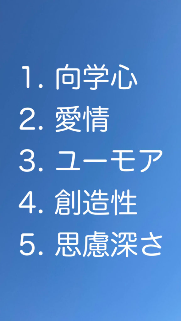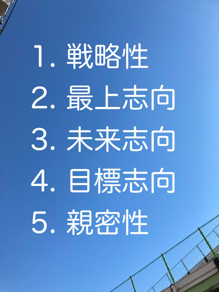 とくに重要なのは、1位〜5位までの、自分の中でトップ5となる資質を知ることです。例えば、僕はテストを受けた結果、上位トップ5の資質は以下であることが分かりました。